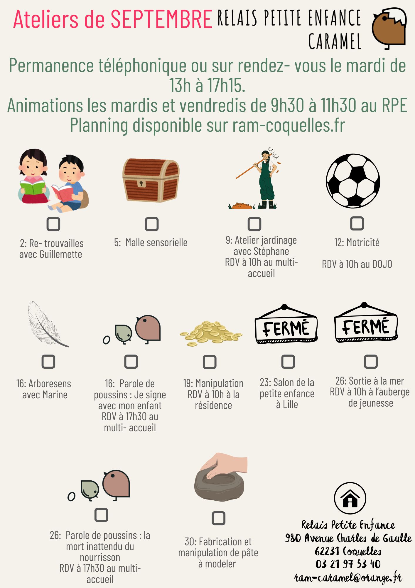 Les ateliers proposés sont communs avec le multi- accueil et le jardin d'enfants. Ils sont gratuits.